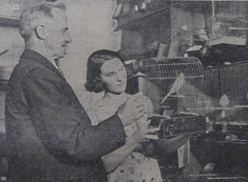 As the birds grow older, Mr. Waters singles out his own fancies for show purposes. “The last slump in industry hit breeders more than anyone can realise,” he told me, “and for that reason alone only the best are worth breeding.” Mr. Waters showed me one bird which has taken over 24 prizes up and down the country this year. He was a very “perky” little fellow as he hopped into Mr. Waters’s special show case. “He knows what he goes into a show cage for.” he told me. “Yon cannot frighten him by making a commotion.” The bird seemed well versed in show tactics, for as I looked round his cage he proudly posed, so that I could admire him from every angle. “I would not take for that little fellow,” said Mr. I Waters. Mr. Waters took other birds from their cages. Some seemed a little flustered. “Perhaps I am frightening them?” I suggested. “Oh, no,” said Mr. Waters, “that is the whole point of showing them. They must get used to strangers.” “How do you restrain their excitement?” I asked. He pointed to a number of hooks on the wall. “I take out a number of birds and hang them up there,” he said. “Then I cause a commotion round the cages. It they show a dislike to being on their own, I leave them there to get used to it. In any case a bird is no use to me it will not be trained. You see they know me perfectly.”